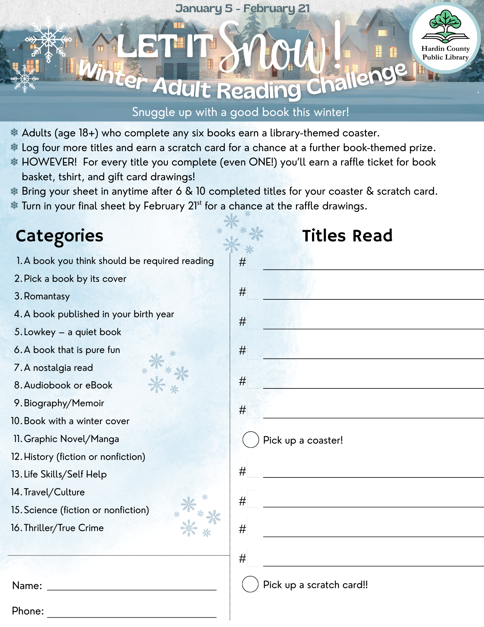 Pick up your "Let It Snow" Adult Winter Reading Challenge at the library or print from here! Do as little or as much as you want; turn in your final sheet by February 21. Adults (age 18+)
